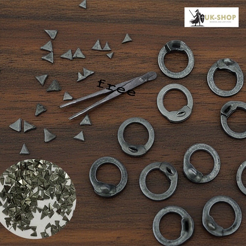 1kg of carbon steel flat rings including wedge rivets, there are approximately 2500 to 2600 rings and rivets in each packet. Make your own chainmail or lengthen your chainmail shirt.