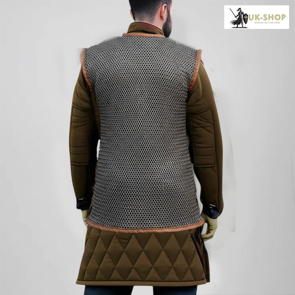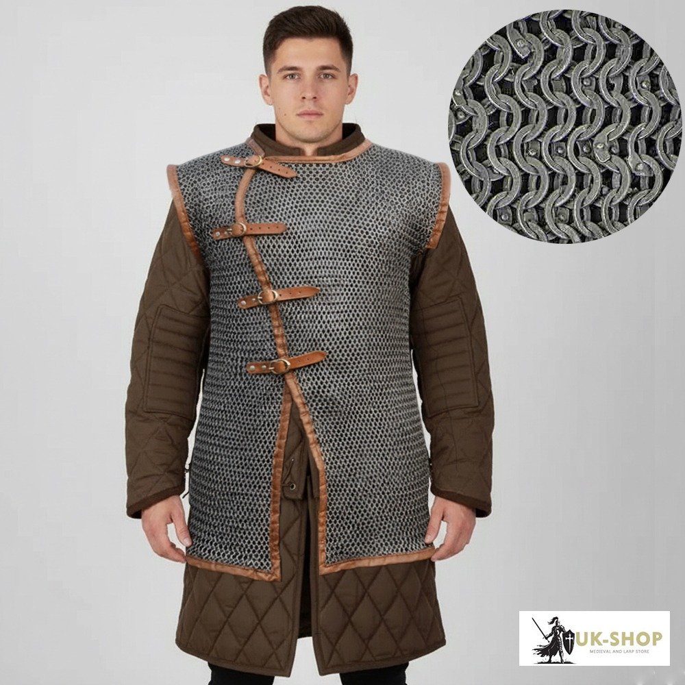 Dark Gray Chainmail Shirt – 9MM Flat Ring Riveted washer with Brown Leather Trim