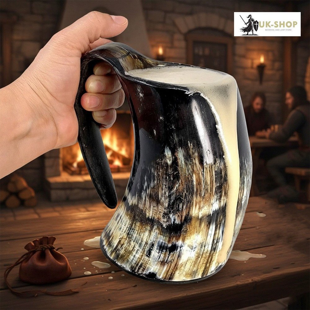 For your next Viking dinner or medieval feast, sip your drink from the Horn Tankard. This horn drinking cup adds a historical touch to any dining experience. The natural horn material gives this tankard its unique, curved shape. Part of the horn curves down and outward, in the opposite direction, to form the loop of the handle. Safe for drinking from and ruggedly unique, this Viking horn tankard is perfect for enjoying your favorite beverage, whether you are attending a Renaissance fair, reenactment, LARP event, or other special occasion.
